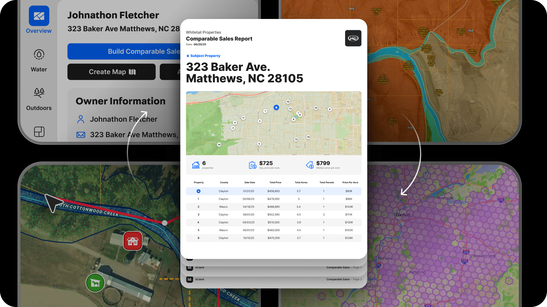 Land id Pro and Pro Unlimited users can generate downloadable, shareable comparable sales reports directly in Land id. No more switching tools. Reports are built using recently sold properties near the subject parcel. They’re great for residential listings, and a must-have for multi-parcel pricing, price-per-acre comps, and other complex analyses.